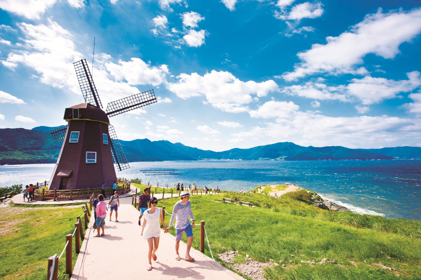 바람의 언덕은 넓은 초원과 푸른 바다가 한눈에 들어오는 인생 사진 스폿이에요. 영화나 드라마 촬영지로도 유명한 이곳은 특히 일몰 시간대에 방문하면 환상적인 풍경을 담을 수 있어요.